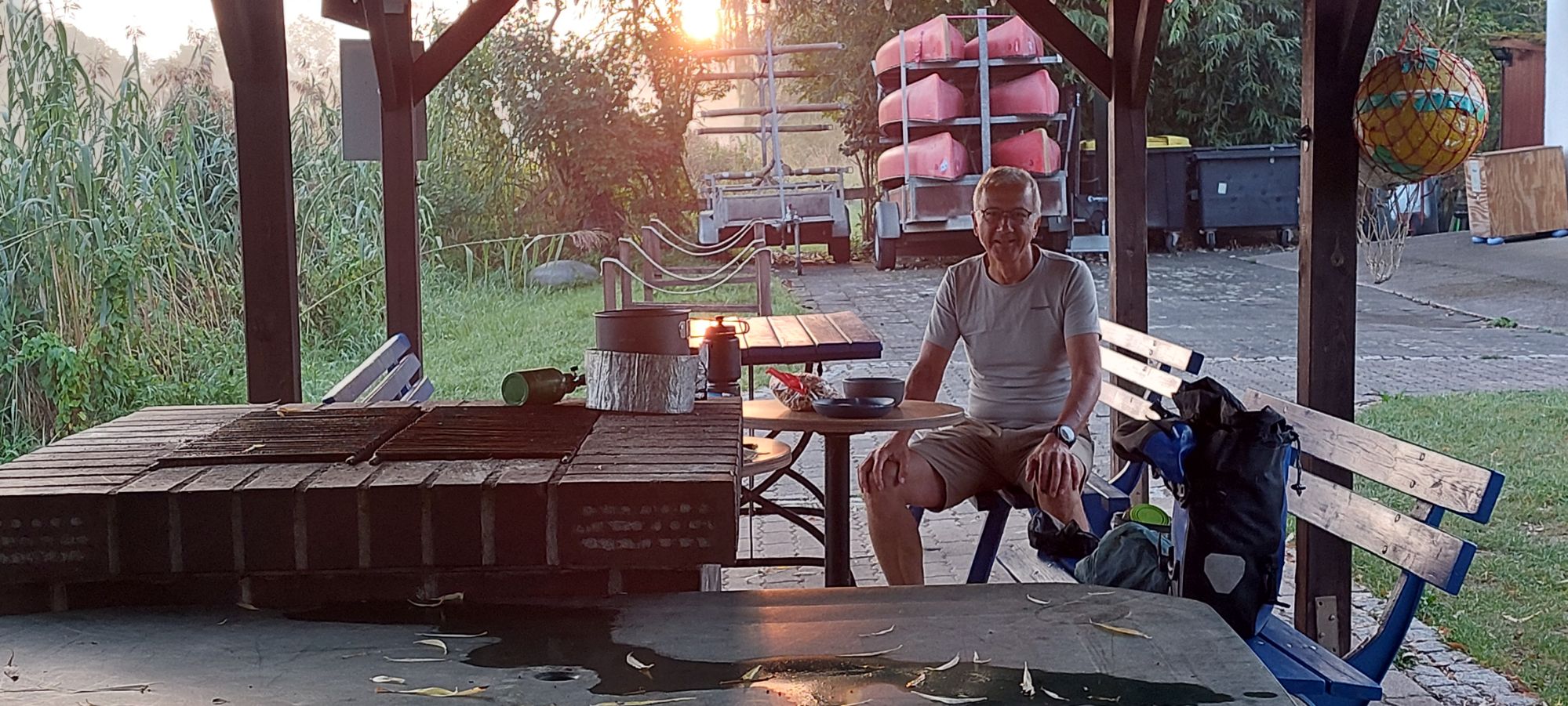 Bij een opkomende zon ontbijten we prinsheerlijk op ons privé terras op de camping.