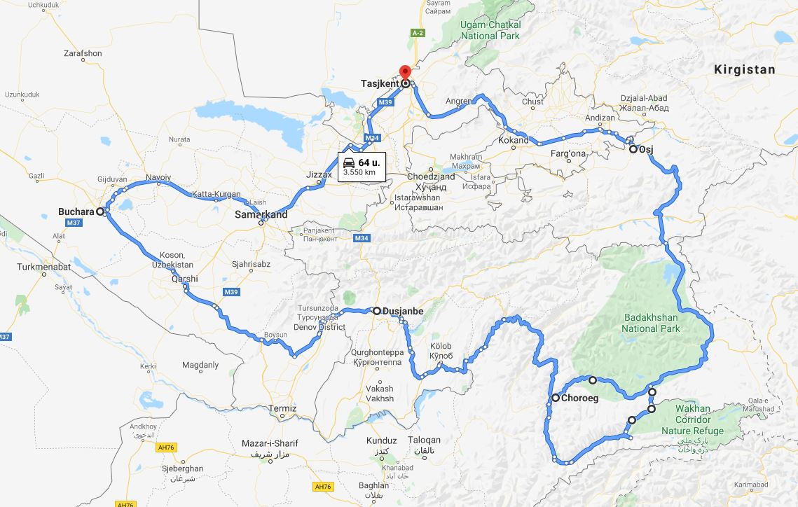 Dit wordt zo ongeveer de route, alles onder voorbehoud natuurlijk. Welke route ik door de Pamir ga volgen zie ik ter plaatse wel, daarom staan er daar twee routes afgebeeld. Ongeveerd 3000 kilometer, dat moet toch wel lukken!
