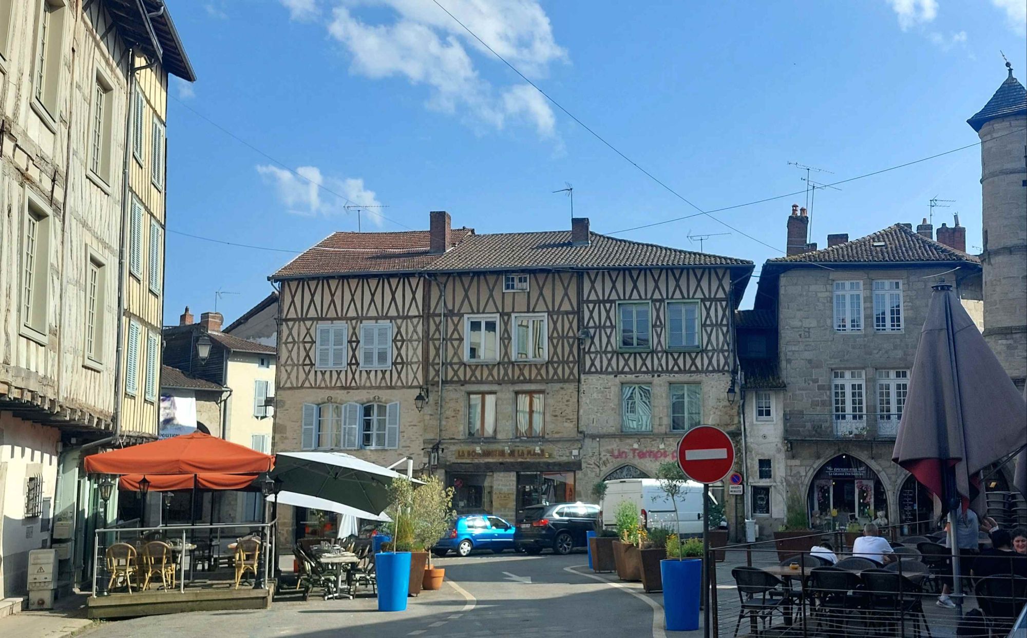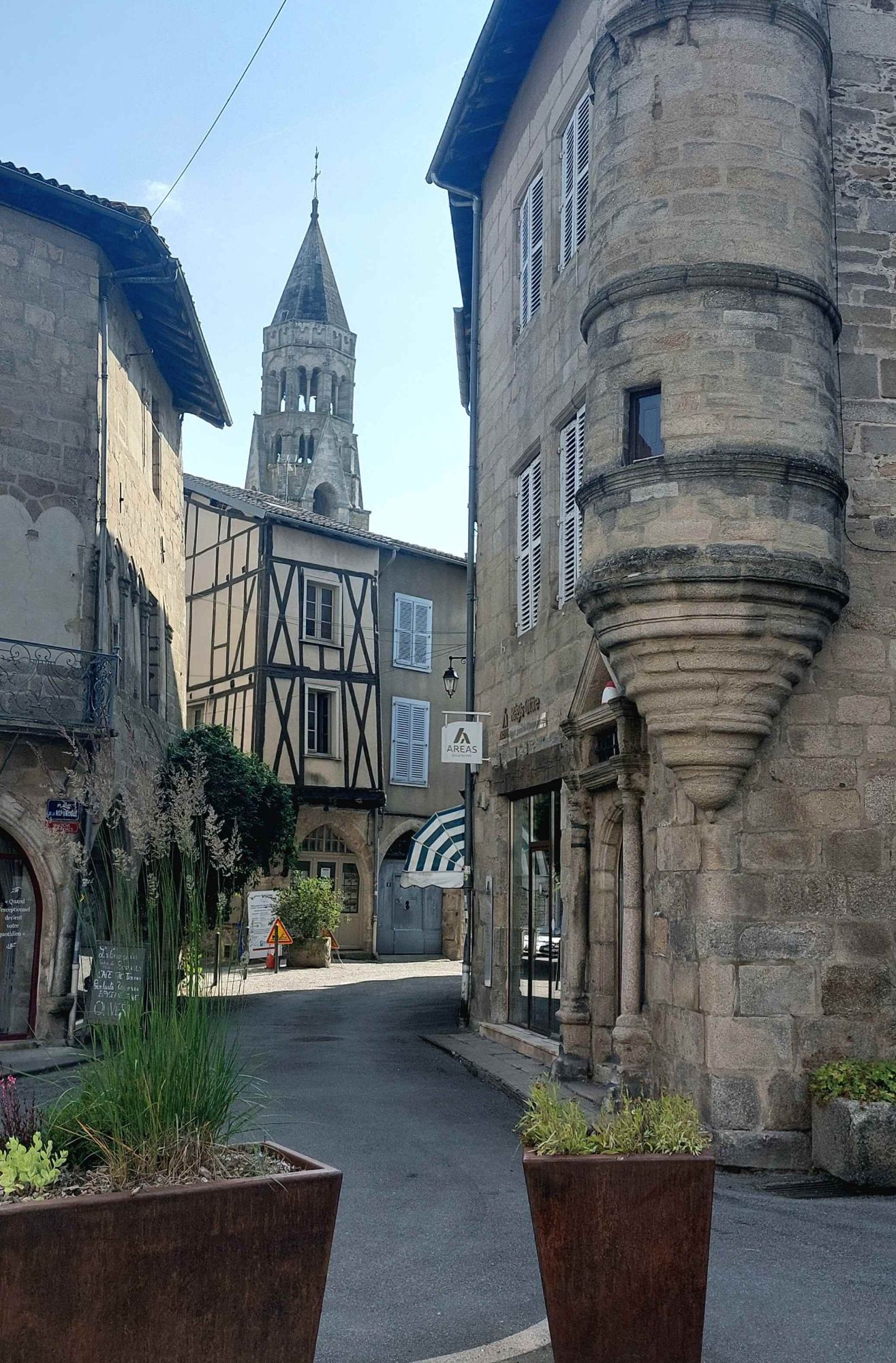 Na een pittig ritje kom ik om 12 uur aan in Saint-Léonard-de-Noblat. Het syndicat d’initiative, waar ik mij moet melden voor de herberg, is gesloten van 12 tot 2, dus er zit niets anders op dan op een terrasje te gaan lunchen en het stadje te bekijken.